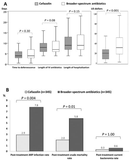 Early and late outcomes in response to definitive therapy in the two matched groups were exhibited in Figure 2. For early outcomes (Figure 2A), in terms of the time-to-defervescence and lengths of IV antimicrobial therapy and hospital stay, were similar between the two groups. Notably, only the lower cost of IV antimicrobial administration was observed in the cefazolin group. Of importance, focusing on late outcomes indicative of the adverse events within 60 days after the end of IV antimicrobial therapy (Figure 2B), despite the similar proportion of post-treatment current bacteremia between two groups, lower proportions of post-treatment ARP infections (2.9% vs. 7.8%, p = 0.004) and post-treatment crude mortality rates (2.0% vs. 5.8%, p = 0.01) were evidenced in the cefazolin group, compared to the BSA group.