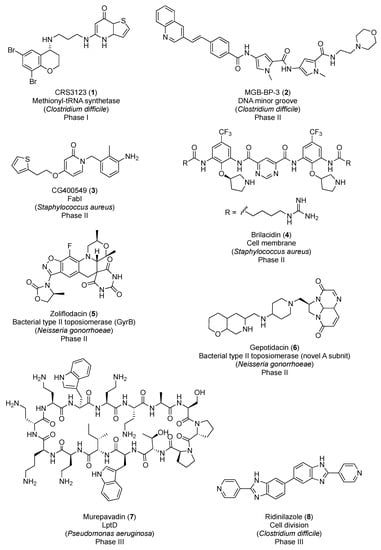 In March 2019, the PEW Charitable Trusts published a resource with the antibiotics in clinical development as of December 2018 [4]. Among the forty-five antibacterial candidates, only eight operate via a completely novel mechanism of action. Figure 1 displays the chemical structures of these new-generation antibacterial candidates. CRS3123 (1), a methionyl-tRNA synthetase inhibitor developed by Crestone Inc., is currently in phase I for the treatment of Clostridium difficile infections [5]. In phase II of clinical development, there are five novel-mechanism antibiotics: MGB-BP-3 (2), CG400549 (3), brilacidin (4), zoliflodacin (5), and gepotidacin (6). MGB-BP-3 (2) from MGB Biopharma Ltd. targets the DNA minor groove and is likewise indicated in C. difficile-associated diarrhea [6]. The benzyl pyridinone CG400549 (3) is an inhibitor of the bacterial enoyl-ACP reductase (FabI) being developed by CrystalGenomics Inc. for the treatment of major cutaneous abscesses due to methicillin-resistant Staphylococcus aureus (MRSA) [7]. Brilacidin (4) is a defensin mimetic that is being investigated for acute bacterial skin and skin structure infections [8]. Zoliflodacin (5), a spiropyrimidinetrione from Entasis Therapeutics, targets the bacterial type II topoisomerase GyrB and shows promise in the treatment of uncomplicated gonorrhea [9]. Gepotidacin (6) is a first-in-class triazaacenaphthylene novel bacterial topoisomerase inhibitor (NBTI) from GSK that has recently completed phase II for the treatment of uncomplicated urogenital gonorrhea as well [10]. Murepavadin (7), an antimicrobial peptidomimetic in phase III for the treatment of pneumonia caused by P. aeruginosa, targets the β-barrel lipopolysaccharide-assembly protein D (LptD) [11]. And, last but not least, ridinilazole (8) is a bis-benzimidazole from Summit Therapeutics that inhibits cell division and, similar to candidates 1 and 2, is currently being investigated for the treatment of C. difficile infections [12].
