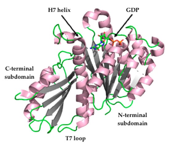 The crystal structure of FtsZ from S. aureus (SaFtsZ) at 2.25 Å resolution (Figure 2) revealed that FtsZ is formed by two subdomains connected by a long core helix (H7 helix). The N-terminal portion comprises a six-stranded parallel β-sheet surrounded by two and three helices, and it contains the GTPase domain. On the other hand, the C-terminal domain is a four-stranded central β-sheet supported by two helices on one of the sides [26,27].
