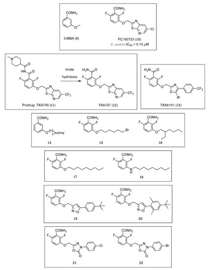 TXA707 (12) and its prodrug TXA709 (11), which are currently being developed by TAXIS Pharmaceuticals, display a superior potency and pharmacokinetic profile that provide evidence of the potential of the benzamide scaffold for its development as an anti-staphylococcal clinical candidate.