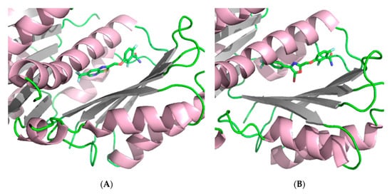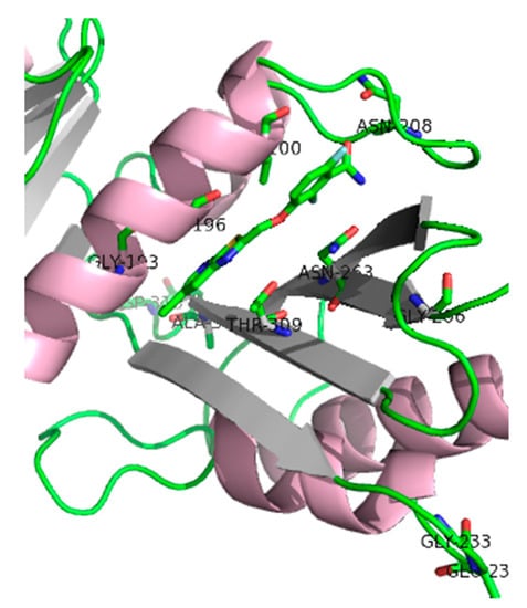 Crystallography studies (2.01 Å) of S. aureus FtsZ-GDP in complex with PC190723 revealed that the ligand binds to a narrow and hydrophobic pocket within the deep cleft formed by the C-terminal half of the H7 helix, the T7 loop, and the C-terminal four-stranded β sheet [27,33]. The difluorobenzamide and the thiazolopyridine moieties are located in the same plane, and the benzamide interacts directly with the T7 loop (Figure 4).