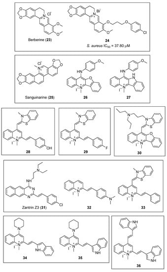 Sun et al., taking natural products berberine (23) and sanguinarine (25) (Figure 6) as a lead, undertook the design and synthesis of a novel library of N-methylbenzofuro [3,2-b] quinoline and N-methylbenzoindolo [3,2-b] quinoline derivatives, which contained a quaternary pyridinium center [51]. Pleasingly, the benzofuroquinolinium 26 and the benzoindoloquinolinium 27 (Figure 6) exhibited significant activity against several Gram-positive and Gram-negative pathogens, which included B. subtilis, S. aureus, E. faecium, E. coli, P. aeruginosa, and K. pneumoniae (Table 3). Remarkably, compound 27 displayed a MIC value against vancomycin-resistant E. faecium superior to that of the reference antibiotics methicillin and vancomycin (MIC values of 16 and 44 μM, respectively). In addition to the antibacterial screening, the authors also investigated the effects of both of these compounds on the polymerization of purified SaFtsZ. Light scattering assays yielded that both 26 and 27 produced an evident inhibition of the SaFtsZ at 33.24 µM. The study of the effects 27 on the GTPase activity of SaFtsZ revealed that this compound is able to inhibit the activity in a dose-dependent manner. Furthermore, microscopic observations of B. subtilis cell morphology showed that 27 increases the cell length of this microorganism, leading to an abnormal cell division and, ultimately, cell death. These results corroborate that chemotypes that interfere with the GTPase activity and FtsZ polymerization are promising starting points for the development of novel antibacterial agents.