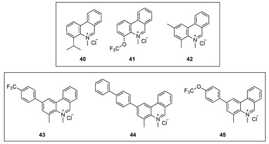 Liu and co-workers designed, synthesized, and evaluated the antibacterial activity of a collection of 5-methylphenanthridium derivatives [60]. Among them, compounds 40, 41, and 42 (Figure 8) exhibited promising antibacterial activities against B. subtilis ATCC 9372 and S. pyogenes PS (MIC = 12.75–15.52 µM). Remarkably, phenanthridium 42 also displayed strong activity against a penicillin-resistant strain of S. aureus (Table 6). Unfortunately, none of the derivatives were able to inhibit the growth of the two Gram-negative bacteria (i.e., E. coli ATCC 25922 and P. aeruginosa ATCC 27853). Afterward, phase-contrast light microscopy was used to carry out the cell morphology studies. All the compounds were able to cause filamentation of B. subtilis or ballooning of S. aureus at their respective MIC values. The effect of the phenanthridium derivatives on the polymerization of mammalian tubulin was also evaluated in vitro. None of the compounds enhanced the polymerization even at concentrations higher than that of the positive control paclitaxel. It is worth noting that, although it is important to assess off-target effects on FtsZ homolog tubulin, evaluating these together with morphologycal studies alone, could, unfortunately, result in a false-positive FtsZ inhibitor.
