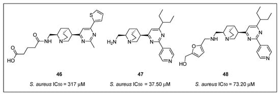 Structure-base virtual screening of a library of approximately 20,000 compounds from Analyticon Discovery against the crystal structure of Methanococcus jannaschiii FtsZ led to the identification of the pyrimidine-substituted quinuclidine 46 (Figure 9) as a new class of FtsZ inhibitors with moderate antibacterial activity [62]. Afterward, an additional cycle of virtual screening of a library of nearly 700 pyrimidine-quinuclidine scaffolds from the same source conducted to quinuclidines 47 and 48 (Figure 9), which were able to inhibit in vitro the proliferation of not only Gram-positive S. aureus, but also Gram-negative E. coli (Table 7), with MIC values ranging from 24.60 to 75.70 µM. Additionally, the authors determined that quinuclidine 47 is able to potently inhibit the FtsZ assembly without affecting the activity of mammalian tubulin, an encouraging finding for the development of novel quinuclidine-based FtsZ inhibitors as antibacterial agents.