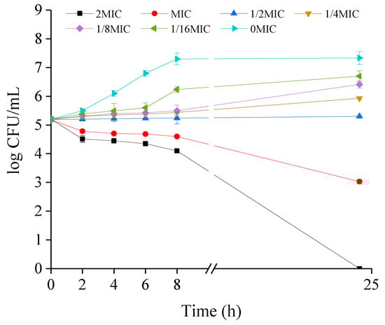 The growth curves were established according to the method described by Xu et al. [22] with minor modifications to assess the antimicrobial effect of VA against E. cloacae. The log-phase bacterial suspension (100 μL, OD600 = 0.5) was diluted 100-fold into TSB containing VA at final concentrations of 0, 1/16, 1/8, 1/4, 1/2, 1 and 2 MIC and incubated at 37 °C with gentle shaking of 150 rpm. An aliquot of the culture was removed at different times of growth (0, 2, 4, 6, 8, and 24 h) and plated on tryptic soy agar (TSA) after adequate serial decimal dilutions. Finally, the plates were incubated at 37 °C for 24 h and colonies were counted manually. A kinetic growth or inactivation curve was constructed for each treatment based on the viable cell counts.