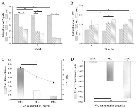 Effects of VA on intracellular (A) and extracellular (B) ATP levels, intracellular pH (pHin) (C) and membrane potential (D) of CREC-16. Values represent the mean of triplicate measurements. Bars represent the standard deviation (n = 3). * p < 0.05, ** p < 0.01.