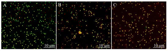 Effects of VA on cell membrane integrity of CREC-16 by confocal laser scanning microscopy. (A) CREC-16 cells treated with 1% DMSO; (B) CREC-16 cells treated with VA at MIC; (C) CREC-16 cells treated with VA at 2MIC.