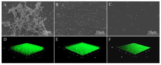 Effects of VA on biofilm formation of CREC-16. Photographs of FESEM (A–C, magnification of 10,000×) and CLSM (D–F, three-dimension). (A,D) CREC-16 cells treated with 1% DMSO; (B,E) CREC-16 cells treated with VA at MIC; (C,F): CREC-16 cells treated with VA at 2MIC.