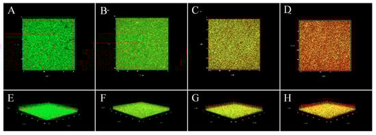Inactivation of VA against CREC-16 cells within biofilms. Plane (A–D) and three-dimensional (E–H) images of CLSM. (A,E) CREC-16 cells within biofilms untreated with VA; (B,F) CREC-16 cells within biofilms treated with VA at MIC; (C,G) CREC-16 cells within biofilms treated with VA at 2MIC; (D,H) CREC-16 cells within biofilms treated with VA at 4MIC.
