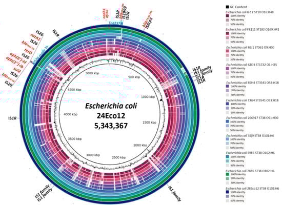 All resistant genes were chromosomally located and mobilized by active composite transposons, such as Tn6237, which has moved to different sites in the E. coli chromosome. In E. coli, the blaOXA-244 gene was disseminated mainly by ST38 clone in Europe and Asia [3,4,5,6,7]. However, non-ST38 E. coli isolates are starting to appear in other countries, showing some genetic differences (Figure 1). As it is known that ISs have an important impact on genetic variability, genome structure and function, and foreign DNA acquisition, we try to decipher the potential of the 28Eco12 isolate to capture and move more resistance genes through an analysis of the IS content and their TSD and flanking-sequences patterns. Notably, this isolate has incorporated at least 69 ISs, showing a IS massive expansion process [14]; the ISs-belonging family IS1 was the most active, with fifteen copies, in which four copies probably were recently mobilized as single transposition events (unique copies) and two mobilized as a composite transposon and responsible of the blaOXA-244-gene integration (Table 1). In spite of finding five IS26 copies, only two of these were mobilized as a composite transposon and transported seven resistance genes. A study conducted by He et al. reported the IS26 participation in the plasmid reorganization from clinical strains [15]. The high IS content found in this multiresistant E. coli isolate indicates a high likelihood to acquire more resistance genes.