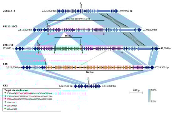 Comparison of the region where the blaOXA-244 gene was inserted within Escherichia coli 28Eco12 isolate. The red arrow corresponds to the blaOXA-244 gene. The mobile genetics elements are shown in different colors. The putative genomic island is shown in purple and its insertion within the tRNA-sec gene is indicated respect to the E. coli strain 266917_2 (GenBank accession number CP026723.1), F8111-1SC3 (GenBank accession number NZ_CP024269), 536-EC15 (GenBank accession number HG977710.1), and K-12 (GenBank accession number NC_000913). The blue rectangles correspond to the gene where the Tn6237 transposon was inserted (green arrows). The pallets represent the target-site duplications. The int gene that encodes the phage integrase protein is shown. Blue shading between pairs of sequences indicates >90% of identity in a window of 400 bp. The scale bar indicates sequence length.