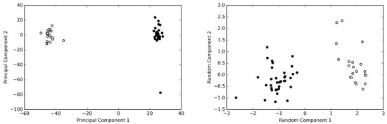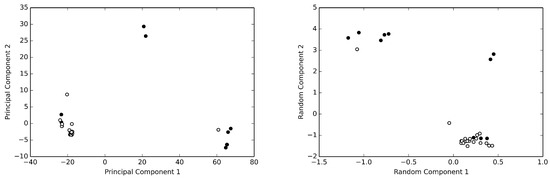 The human serum albumin data set. Principal component analysis (left panel) and random projection analysis (right panel) of the of the normalized HSA data set are reported. HSA structures without bound fatty acids are reported as withe circles, while those with bound fatty acids are reported as black circles. Both methods clearly allow to recognize two clusters of structures. Note the different level of dispersion provided by the two methods.