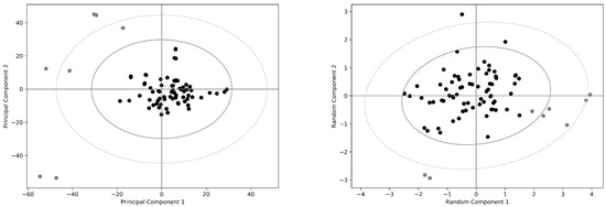 The Mus musculus COX-2 data set. Principal component analysis (left panel) and random projection analysis (right panel) are reported of the normalized data set containing the COX-2 monomers. Outliers in the principal component analysis are reported as gray circles in both panels; 95% and 99% confidence levels are drawn in dark and light gray, respectively. Note that both methods do not identify clearly separate clusters of structures.