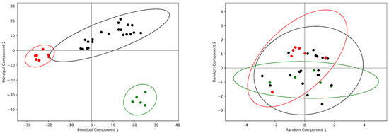 The Ovis aries COX-1 data set. Principal component analysis (left panel) and random projection analysis (right panel) are reported of the normalized data set containing the COX-1 monomers. Principal component analysis identifies on this data set three clusters of structures, indicated as black, red and withe circles. On the contrary the random projection method returns for this data set a single cluster; the entries are colored as in the left panel. The 99% confidence levels for the clusters are reported are drawn in the same color.