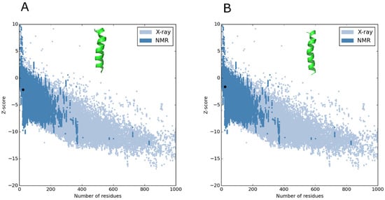 To avoid mistakes in choosing the best peptide structural model, the tools PROSA and RAMPAGE can be used to refine and validate protein or peptide models. After processing the data, both peptides exhibited helical structures, which were within the viable quality ranges (Figure 1). Z-score values obtained by PROSA software, which assumes that most of the data points in a multidimensional NMR spectrum are at locations not occupied by signals [], showed that both peptides were within the favorable region of structures, suggesting that they have characteristics of native structures [].