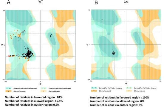 Regarding the RAMPAGE validation (Figure 2), it was observed that the ∆M peptide had all the residues within the favorable region, suggesting high structural reliability. On the other hand, the WT peptide exhibited 84% of its residues within the favorable region and 65% in the permitted region, suggesting that the parameters of the peptide structure remain within the limits of good quality and stability [].