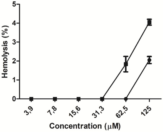 The hemolytic activity of the peptides was evaluated in human erythrocytes. At the lowest peptide concentrations, ranging from 3.9 to 31.3 µM, no hemolytic effect was observed. At higher concentrations, a hemolytic concentration–response effect was observed for each peptide (Figure 3), lysing 2% and 4% of the total erythrocyte population at the maximum concentration evaluated for the WT and ΔM peptides, respectively. The minimum hemolytic concentration (MHC) was 62.5 µM for the WT peptide and 31.3 µM for the ΔM peptide (Table 1), suggesting that amino acid residue substitutions in the modified peptide double its hemolytic activity.