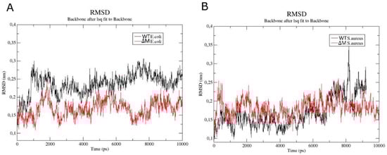 RMSD analysis of the backbone atoms of WT (black color) and ∆M (red color) peptides in E. coli (A) and S. aureus (B) membranes.
