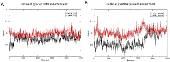 The radius of gyration is defined as the distribution of atoms of a protein around its axis and, specifically, is the length that represents the distance between the point when it is rotating and the point where the energy transfer has the maximum effect []. In addition, it serves as an indicator of protein structure compaction []. Figure 5 shows the radius of gyration of each peptide in the membranes of E. coli (Figure 5A) and S. aureus (Figure 5B). In membrane models that simulate Gram-negative bacteria, the WT peptide showed variation of the radius of gyration of 0.05 nm, which is very similar to that of ∆M; however, in the time interval of 8000–9000 ps, there is slight variation of approximately 0.06 nm in the ∆M. On the other hand, in the S. aureus system, there is a considerable change in the WT peptide of approximately 2 nm with respect to 1 nm in the ∆M (Figure 5B), originating from 7000 ps (7 ns).