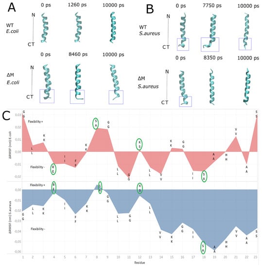 Comparison of the stability and flexibility of the helical structures of WT and ∆M peptides. (A) E. coli membrane model and (B) S. aureus membrane model. In blue is indicated the notorious changes in alpha helix structure. (C) ΔRMSF (nm) between WT and ∆M peptides, showing changes of residues in green circles. It is also showed positive values as flexibility + and negative values as flexibility -. The top letters are from sequence of ∆M peptide and the bottom letters belongs to sequence of WT peptide.