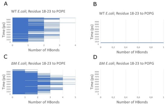 Hydrogen bond count between residues 18–23 of the peptides and phospholipids of E. coli membrane. WT interacting with POPE (A) and POPG (B). ∆M interacting with POPE (C) and POPG (D).