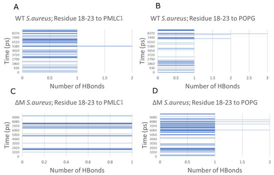 Hydrogen bond count between residues 18–23 of the peptides and phospholipids of the S. aureus membrane. WT interacting with PMLC1 (A) and POPG (B). ∆M interacting with PMLC1 (C) and POPG (D).