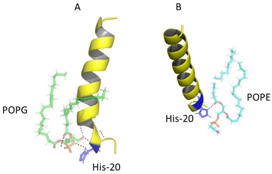 Finally, a more detailed analysis of the simulation of the WT peptide with membrane models of S. aureus and E. coli was performed to determine with which phospholipid the carboxy-terminal structure (residues 18–23) was destabilized. It was observed that the interaction of POPG from S. aureus with WT occurs mainly via hydrogen bonds between histidine 20 and the phospholipid polar region, generating destabilization and loss of the helical structure in that region (Figure 9A). This same residue forms a hydrogen bond with a carbonyl from POPE in the E. coli membrane (Figure 9B) and it was also observed that this interaction was maintained during most of the simulation without losing the helical conformation of the peptide.