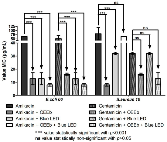 The antibacterial effect of the blue LED light is well known in the literature [18,19]. However, against both bacterial strains assayed, the blue LED light alone demonstrated a MIC ≤ 1024 μg/mL. In the modulation tests, association of OEEb with amikacin and gentamicin presented a synergistic antibacterial effect against the multi-resistant strain of Escherichia coli (Figure 2). The effect of this association was further enhanced was by exposure to blue LED light. In the tests with the multi-resistant strain of Staphylococcus aureus, association with OEEb or blue LED light increased the activity of amikacin. However, the simultaneous association of OEEb with blue LED light and the antibiotics did not present a significant antibacterial effect.