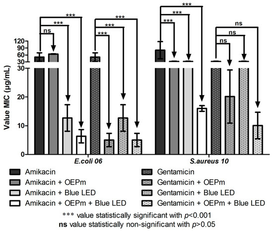 Geometric mean of the minimum inhibitory concentration (μg/mL) of the aminoglycosides alone or in association with the OEPm and the blue LED light against the MDR strains E. coli 06 and S. aureus 10.