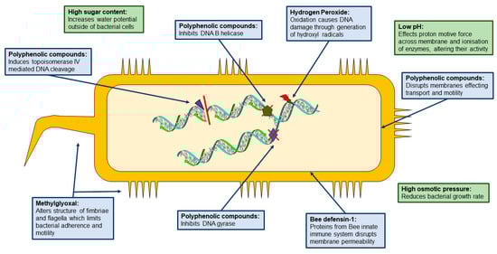 The main constituents attributed to honey’s antimicrobial activity and their mechanism of action. Direct inhibitory factors affect cellular mechanisms (blue), indirect inhibitory factors have a wider ranging effect on the bacterial cell (green).