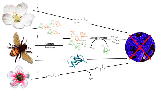 - Kwakman, P.H.S.; Zaat, S.A.J. Antibacterial components of honey. IUBMB Life 2012, 64, 48–55. [Google Scholar] [CrossRef]