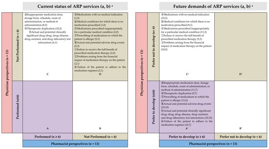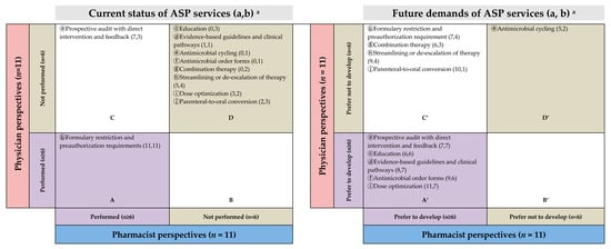 As an example, “Prospective audit with direct intervention and feedback” of ASP and “Inappropriate medication dose, dosage form, schedule, route of administration, or method of administration” of ARP were mentioned several times during the interviews by both professions. The gap analysis visualized the result in which pharmacists believed that the service has been implemented, but physicians do not (Figure 1C and Figure 2C), and in the future, both physicians and pharmacists agree on the need for this service (Figure 1A’ and Figure 2A’ ).