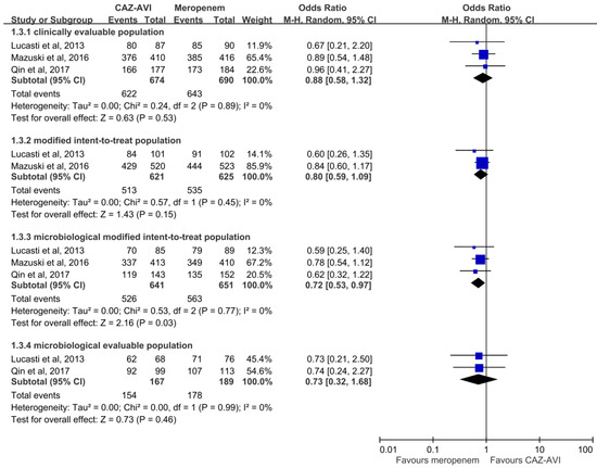 Overall, CAZ–AVI had a clinical cure rate at TOC in the CE population similar to that of meropenem (622 (92.3%) vs. 643 (93.2%), OR, 0.88; 95% CI, 0.58–1.32; I2 = 0%, Figure 1) in the pooled analysis of the three RCTs [15,16,17]. Similar trends were also observed in the MITT population (513 (82.6%) vs. 535 (85.6%), OR, 0.80; 95% CI, 0.59–1.09; I2 = 0%) and ME population (154 (92.2%) vs. 178 (94.25), OR, 0.73; 95% CI, 0.32–1.68; I2 = 0%) in the pooled analysis of two studies. However, the pooled analysis of the mMITT population showed CAZ–AVI was associated with a lower clinical cure rate when compared with meropenem (526 (82.1%) vs. 535 (85.6%), OR, 0.72; 95% CI, 0.53–1.97; I2 = 0%). In terms of clinical cure rate at EOT, the efficacy of CAZ–AVI was comparable to that of meropenem in the CE population (648 (94.3%) vs. 670 (95.6%), OR, 0.77; 95% CI, 0.47–1.25; I2 = 0%), MITT population (552 (88.9%) vs. 575 (92.0%), OR, 0.70; 95% CI, 0.47–1.06; I2 = 5%) and ME population (169 (97.1%) vs. 187 (96.4%). OR, 1.26; 95% CI, 0.39–4.08; I2 = 0%), but lower than that of meropenem in the mMITT population (487 (87.6%) vs. 519 (92.3%), OR, 0.59; 95% CI, 0.39–0.87; I2 = 0%).