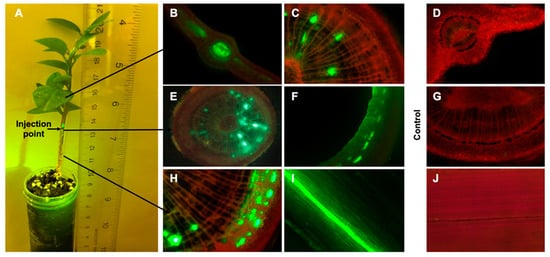 - Hu, J.; Jiang, J.; Wang, N. Control of citrus Huanglongbing via trunk injection of plant defense activators and antibiotics. Phytopathology 2018, 108, 186–195. [Google Scholar] [CrossRef]