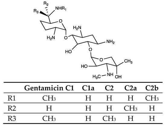 General structure of gentamicin C components. There are mainly five variants of gentamicin C: C1, C1a, C2, C2a, and C2b. They differ from each other at the three R sites annotated in this structure. The corresponding groups at each R site of these five components are listed in the table.