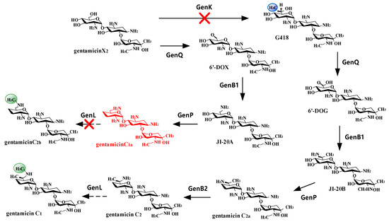 Most of the key steps in the biosynthesis of gentamicin C components have been elucidated in previous work (Figure 2): genK is an S-Adenosyl methionine (SAM) dependent methylation gene and is responsible for C-6’ methylation [11,12]; genP is thought to be responsible for 3’, 4’ double dehydroxylation [13,14]; genQ is related to Gentamicin C-6’ dehydrogenation [15]; genB1 catalyzes the transformation of G418 to JI-20B and X2 to JI-20A [16]; genB2 involves in the epimerization of gentamicin C2 and C2a in vitro [16]; and genL is reported to be responsible for converting C1a to C2b and C2 to C1 of Micromonospora echinospora ATCC15835 [17].