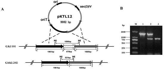 The recombinant plasmid pKTL12 was transformed into E. coli ET12567, and introduced into M. purpurea GK1101 (ΔgenK) using the conjugative transfer on MS medium at 37 °C for 16 h. After overlaying with medium containing apramycin and nalidixic acid, the incubation was continued at 37 °C for 5 days. Single and double crossover mutants were then selected and screened as previously described [20]. To check whether a double crossover event had occurred, we designed primers N5/N6 to screen single and double crossover mutants. We selected the ampicillin-sensitive colonies and lysed them to obtain genomic DNAs, which were used as templates to amplify using primers N5/N6 to check whether genL was successfully deleted from the genome. Sequencing was also used to further verify the results. The single crossover mutant was named GbKL201 and the double crossover was named GbKL202. The same method was used to construct GbL201 and GbL202.
