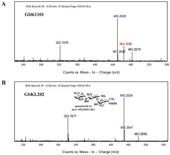 Metabolites of the disruption strain. (A) Mass spectrum analysis of metabolites from M. purpurea GK1101 (ΔgenK). (B) Mass spectrum analysis of metabolites from GbKL202 (ΔgenKΔgenL). In particular, the blue numerical value is gentamicin C1a (m/z = 450.2924[M + H] +, m/z = 451.2947[M + D] +), the green numerical value is gentamicin C2b (m/z = 464.30[M + H] +).