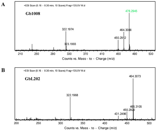 Metabolites of the disruption strain. (A) Mass spectrum analysis of metabolites from M. purpurea Gb1008. (B) Mass spectrum analysis of metabolites from GbL202 (ΔgenL). Note that the purple numerical value is gentamicin C1 (m/z = 478.2945[M + H] +).