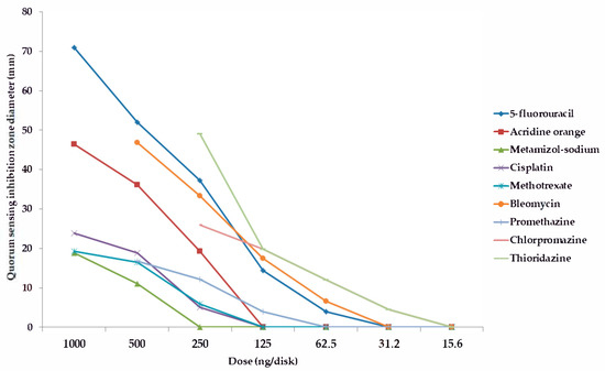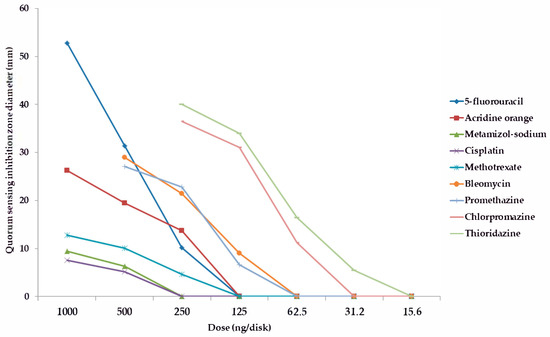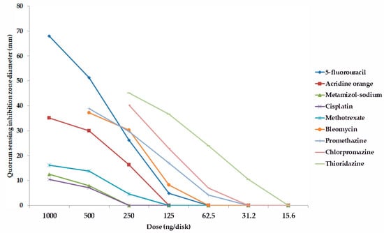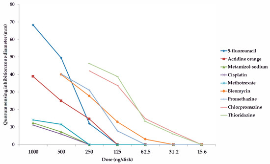 Highlights of the study: during our experiments, the antibacterial and QS-inhibitory capacities of 45 currently used pharmacological agents (sourced from diverse clinical indications and molecular characteristics) have been tested in a semi-quantitative in vitro model, for which such data were not available whatsoever, or data were generated on different model systems. Fourteen of the tested drugs showed varying degrees of antibacterial activity on the tested bacterial strains, while five drugs (promethazine, chlorpromazine, thioridazine, 5-fluorouracil, and bleomycin) showed dose-dependent QS-inhibitory activity, which was more potent than acridine orange. Based on the results of this experiment, the characterization of active pharmaceutical compounds on different QS-based model systems is highly recommended, in addition, the continuous screening of the existing drug pool may result in the establishment of a library of clinically relevant drugs with virulence-modulating properties. The in vitro antibacterial properties of the tested drugs highlight the tendency of some non-antibiotic pharmacological agents to affect bacterial viability, which is important in the context of the human gut microbiome: in addition to antibiotics, these drugs may also have detrimental effects on the species composition of gut bacteria (leading to disease), therefore this study provides novel insights in this aspect as well [118].