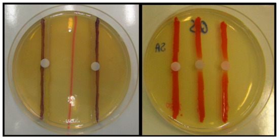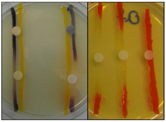 Presentation of positive and negative controls during semi-quantitative QS-inhibition assay, using parallel inoculation disk diffusion method, Left: C. violaceum CV026 and Sphingomonas paucimobilis Ezf 10–17 (one effective compounds can be observed in the lower right corner); Right: S. marcescens AS-1 (two effective compound can be observed on the left side and center).Activity is represented as discolored bacterial colonies with no detected growth inhibition.