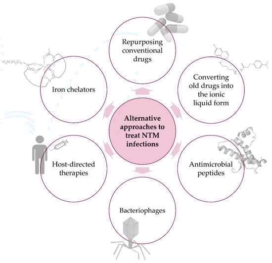 In light of the many difficulties and limitations identified above, it is evident that new antimycobacterial strategies must be developed to achieve better global control of NTM infections. New, alternative treatments should be able to allow shorter treatment durations, reduced daily pill burden and dose frequency, treatment of multidrug resistant strains, and the possibility of co-administration with other relevant drugs (e.g., anti-HIV drugs). In recent years, renewed efforts have been made towards the discovery of alternative approaches to tackle NTM infections. In the next sections, we will cover some of the most promising, new alternatives reported in the literature, which include the repurposing of conventional drugs and the use of ionic liquids, antimicrobial peptides, bacteriophages, iron chelators, and host-directed therapies (Figure 1).