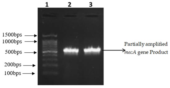 Partially amplified mecA gene Product (583 bps). Lane 1: 100 bp DNA ladder RTU, Cat # DM001-R500. Lanes 2, 3: Representative isolates with amplified gene product.