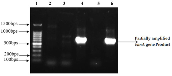 Partially amplified vanA gene Product (713 bps). Lane 1: 100 bp DNA ladder RTU, Cat # DM001-R500. Lane 2, 3 & 5: Representative isolates where no amplification was observed. Lane 4 & 6: Representative isolates with amplified gene product.