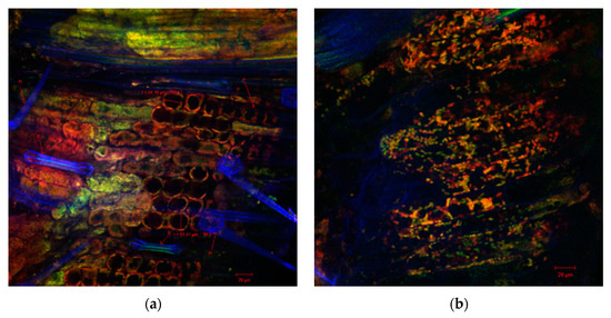 Confocal laser scanning microscopy images of the wheat sprout sections variants: (a) ultrapure water control samples; and (b) methanol control samples.
