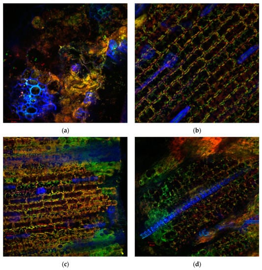 Confocal laser scanning microscopy images of the wheat shoot sections variants of the N. alba leaf extract treatments: (a) 10 µg/mL, (b) 100 µg/mL, (c) 500 µg/mL, and (d) 1000 µg/mL.