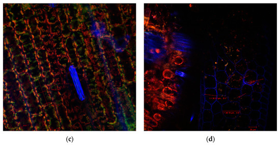 Confocal laser scanning microscopy images of the wheat shoot sections variants of the N. alba root extract treatments: (a) 10 µg/mL, (b) 100 µg/mL, (c) 500 µg/mL, and (d) 1000 µg/mL.