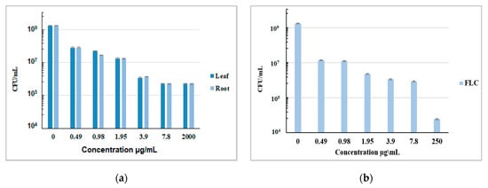 CFUs of C. glabrata CBS 138 strain, cultured in the presence of the indicated concentrations of the N. alba leaf and root (a) extracts and fluconazole (b).
