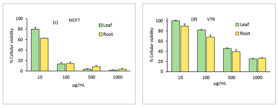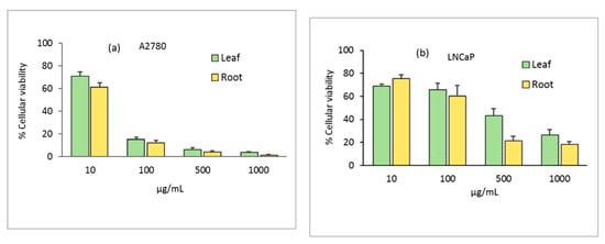 Our results indicated that in all cancer cell lines studied, the cytotoxicity was high, with IC50 values in the range of 23–274 µg/mL for the leaf and 18–152 µg/mL for the root (Table 2). Moreover, the root extracts had a slight tendency to be more cytotoxic, as can be observed in Figure 7.