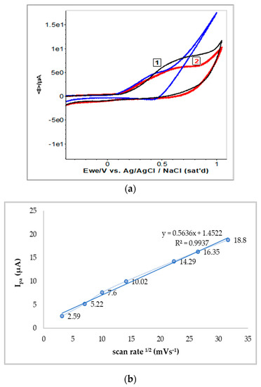 Cyclic voltammograms recorded for the N. alba leaf (1) and root (2) extracts compared with quercetin (blue line). E = ± 1 V vs. Ag/AgClsat., scan rate of 100 mV s−1 (a). Dependence of the anodic current vs square root of the scan rates (b).